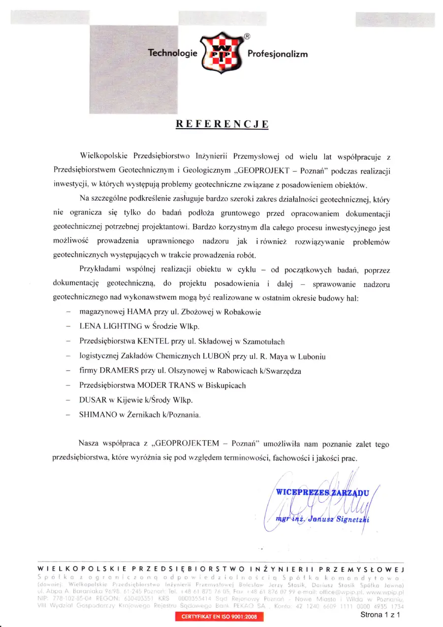 Jesteśmy jedną z najdłużej działających firm geologicznych na polskim rynku, na przestrzeni ponad 60 lat wywiązaliśmy się z ogromną ilością powierzonych nam realizacji. Zawsze staramy się budować zaufanie naszych klientów. Każdy Zamawiający i każdy temat jest dla nas ważny, dzięki czemu możemy przedstawić poniższe referencje.